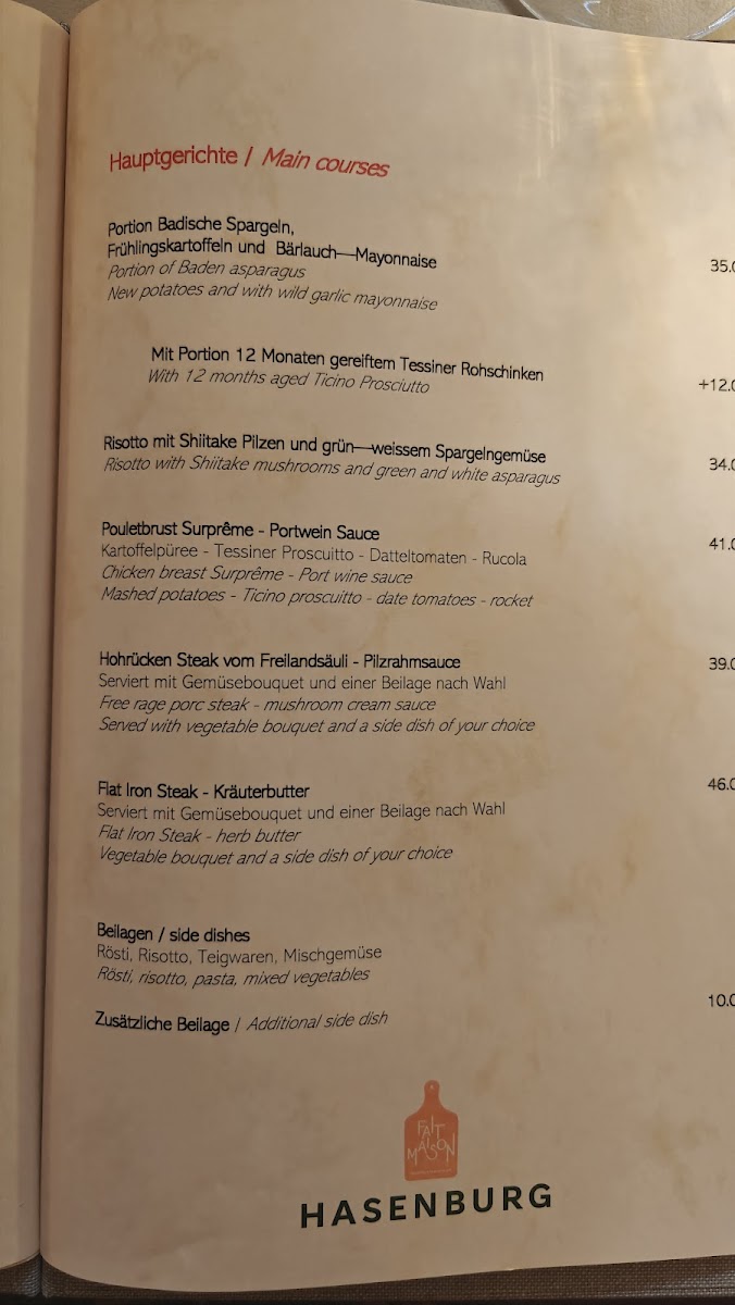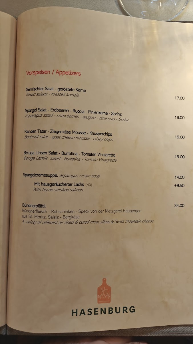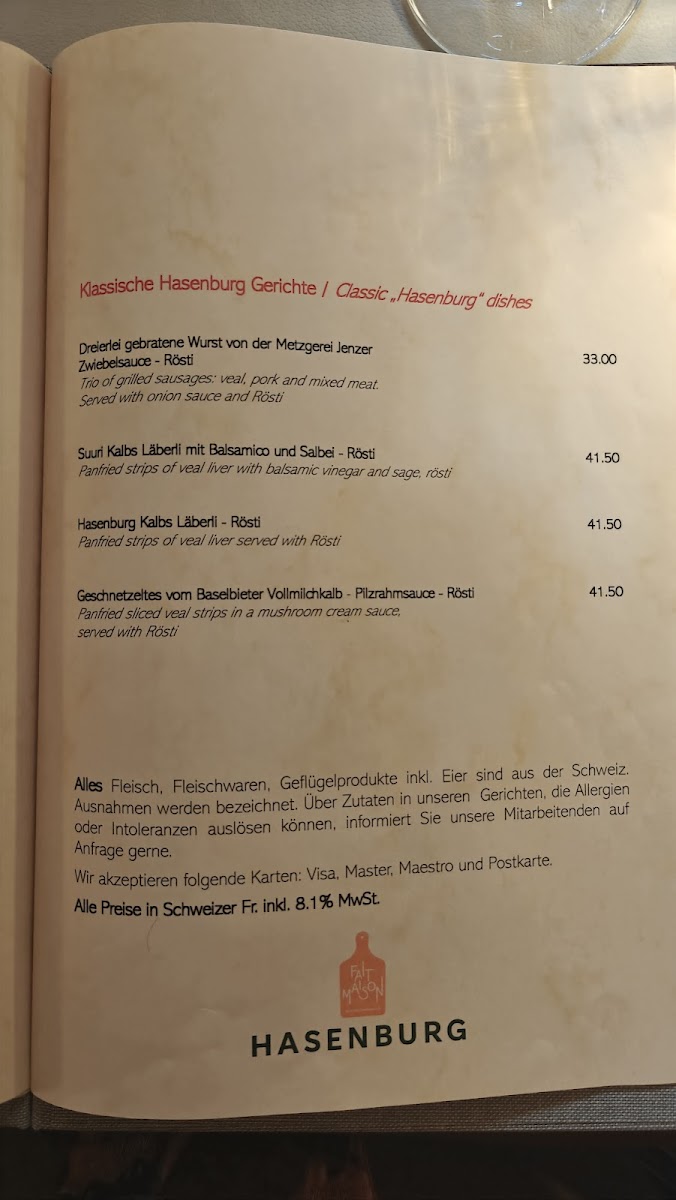 The menu at Restaurant Hasenburg offers a delightful variety of traditional and hearty dishes that are sure to satisfy any palate. For a satisfying main course, the Rindslaberli Mit Rösti is a standout, offering a classic Swiss combination of tender beef with crispy rösti. Another popular choice is the Trois Saucisses Grillées Et Roesti, a flavorful plate of grilled sausages paired with the ever-popular rösti. The restaurant also serves a delicious Beef Tatar, which is finely prepared and perfect for those who enjoy a raw meat dish. For those looking for something lighter, the Appetizer Salomon with Lettuce and Lentils offers a refreshing option. No meal is complete without dessert, and the Crème Brûlée is a perfect way to end your meal, offering a rich, creamy contrast to the crispy caramelized top. Alternatively, the Mousse Au Chocolat provides a decadent chocolate experience. For a more seasonal treat, try the Feines Vermicelles Mit Schlagrahm, a sweet chestnut dessert topped with whipped cream, or the comforting Hasenburg Desert. A lighter option, the Insalata Mista Con Rösti brings together fresh greens and rösti for a perfect balance of textures. The Fondue is a must-try for cheese lovers, offering a warm, gooey experience. For those seeking a hearty meal to share, the Hackbraten Für 2 Personen is a filling dish that pairs beautifully with any side. If you prefer classic Italian flavors, the Pasta Bolognese is a rich and flavorful choice. With such a varied menu, Restaurant Hasenburg ensures that there is something for everyone to enjoy.